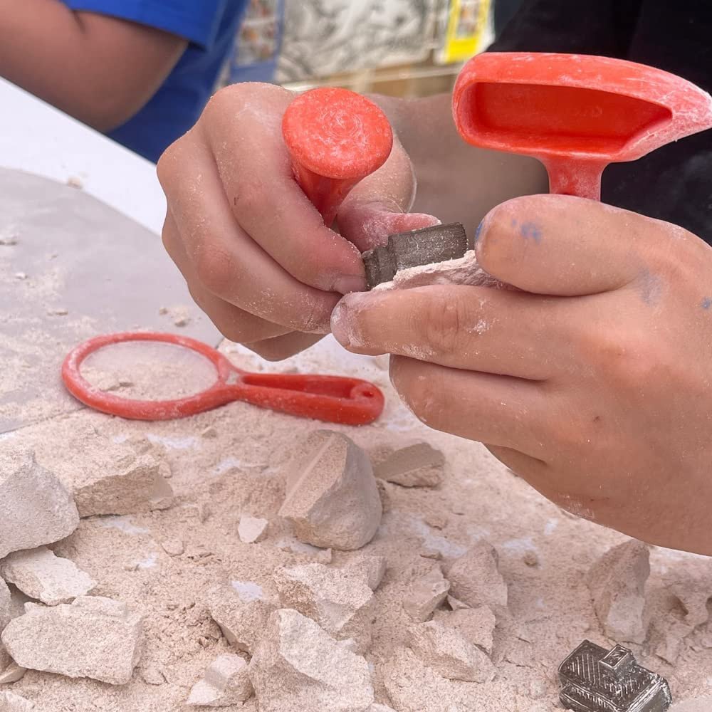 NOTĂ: Setul educațional de săpături arheologice Arkerobox este conceput pentru ca copiii să imite un arheolog. Săpătura trebuie făcută cu răbdare, ca arheologii adevărați. Întregul proces poate dura câteva ore sau zile in mod normal. Aceasta este esența distracției de săpat. Dacă doriți să accelerați procesul de săpare, puteți să pulverizați puțină apă pe el sau chiar să o scufundați într-o chiuvetă timp de un minut înainte de a săpa întregul bloc. Acest lucru va înmuia blocul. Cu toate acestea, acest lucru poate slăbi „distracția de a săpat” intenționat. De asemenea, fiți conștienți de faptul că blocul umed poate păta.