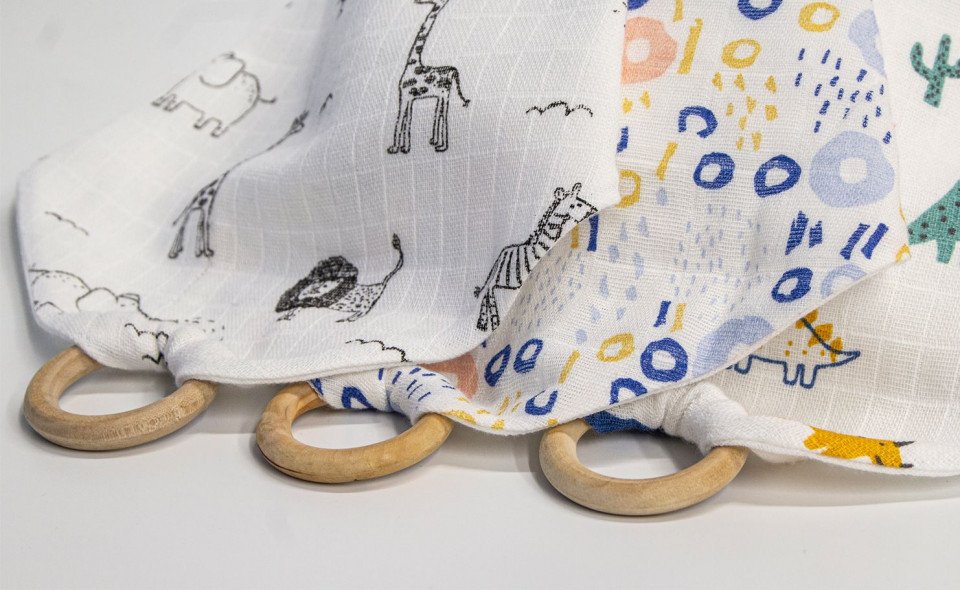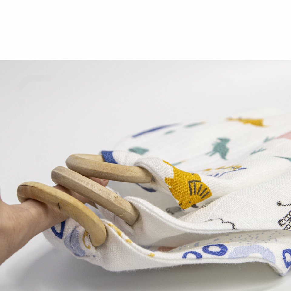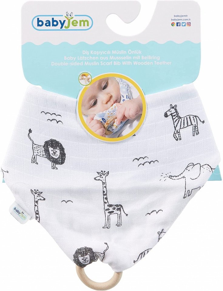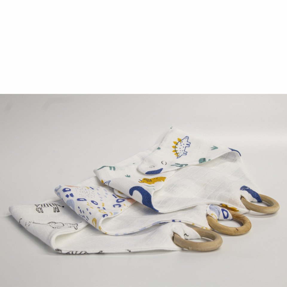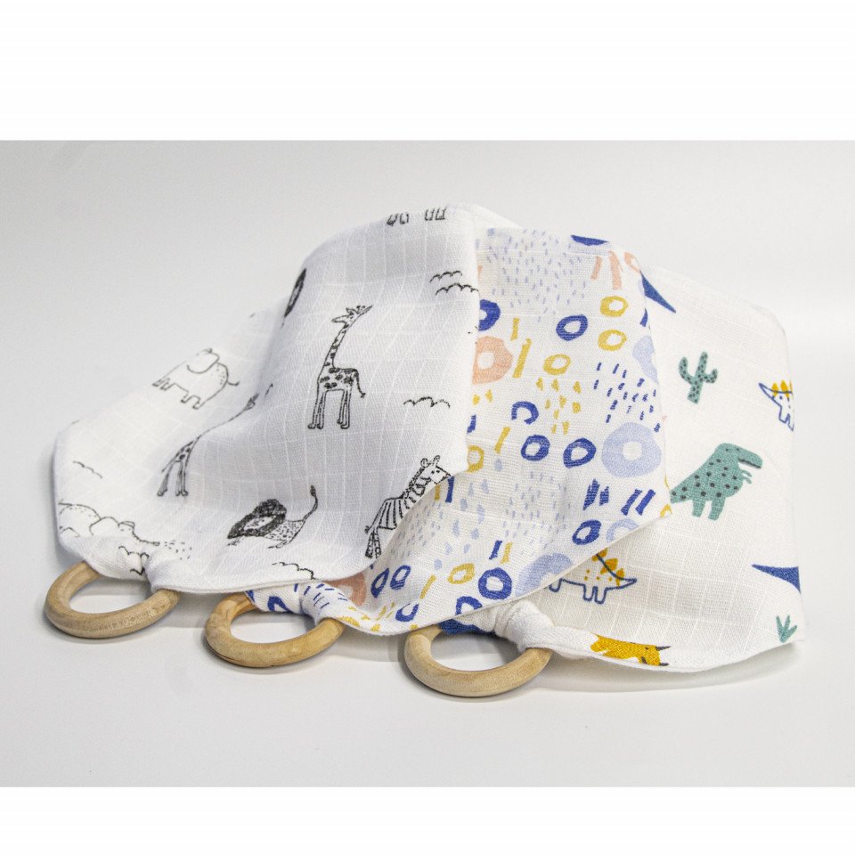 Baveta din muselina cu inel din lemn BabyJem (Model: Zoo)