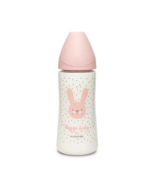 Biberon 360 ml cu tetină rotundă din silicon, debit dens, iepuraș roz Hygge Suavinex