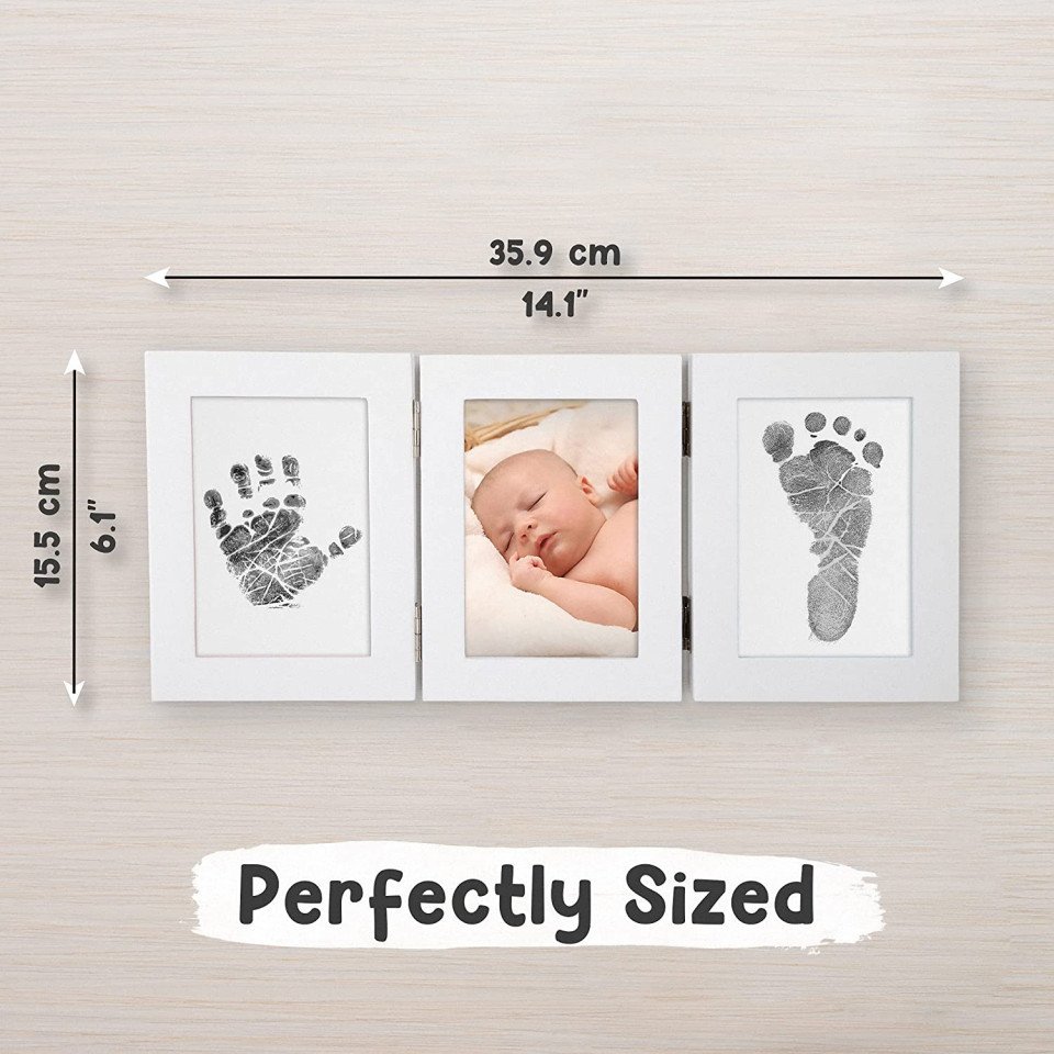 Tot ceea ce trebuie sa faceti este sa apasati manuta si piciorusul pe suportul cu cerneala si sa inramati apoi micile amprente, alaturi de o fotografie haioasa a celor mici.
