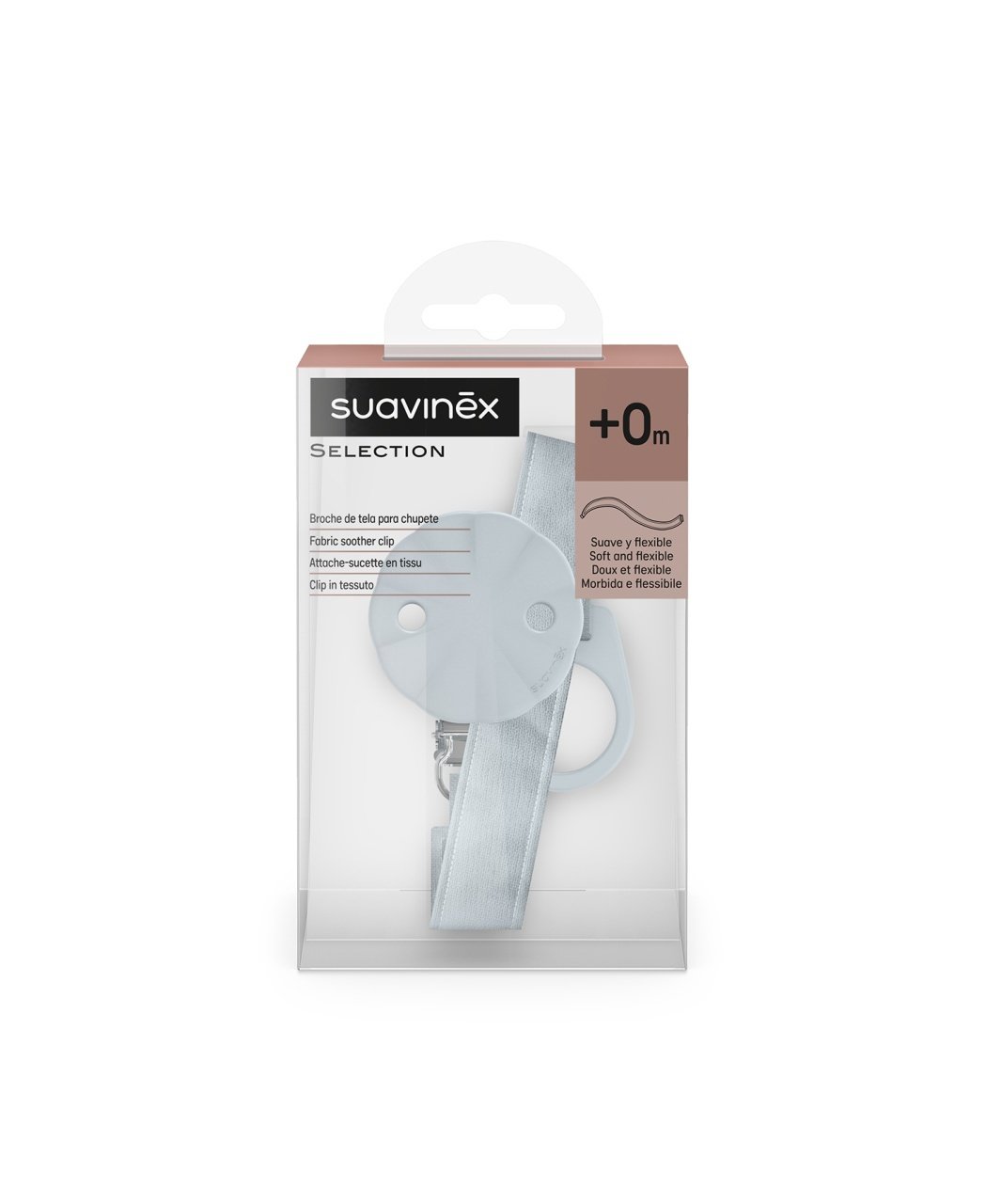 Clipsul este prevăzut cu un disc de silicon sigur, care se atașează ferm de hainele copilului fără a le deteriora. Banda moale din bumbac se așază delicat pe haine, oferind confort sporit, iar inelul flexibil din silicon asigură compatibilitatea perfectă cu majoritatea suzetelor.
