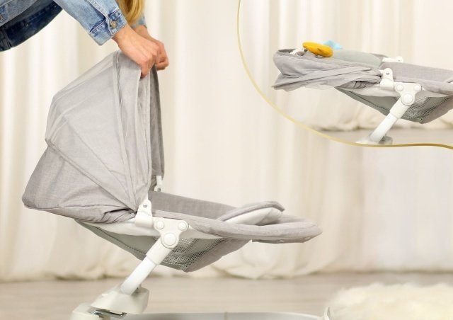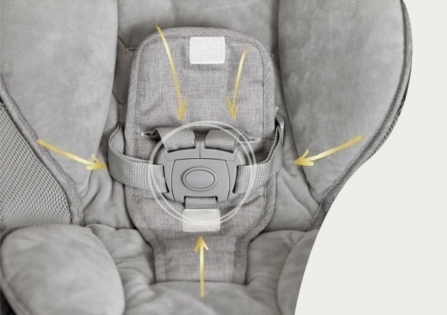 Leagănul este un gardian de încredere al siguranței, atât pentru bebelușii activi, cât și pentru cei mai liniștiți. Cele 5 centuri acoperite cu material protector stabilizează poziția copilului, astfel încât nu trebuie să îți faci griji că micuțul ar putea aluneca sau cădea din scaun.