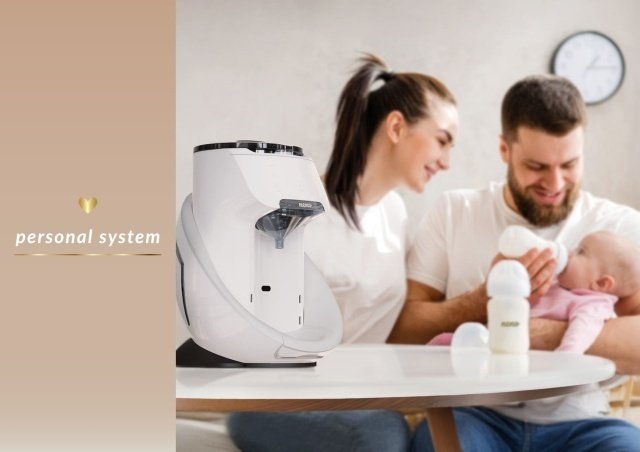 - Apa trece prin sistemul de încălzire și ajunge la temperatura setată înainte de a fi turnată în biberon.