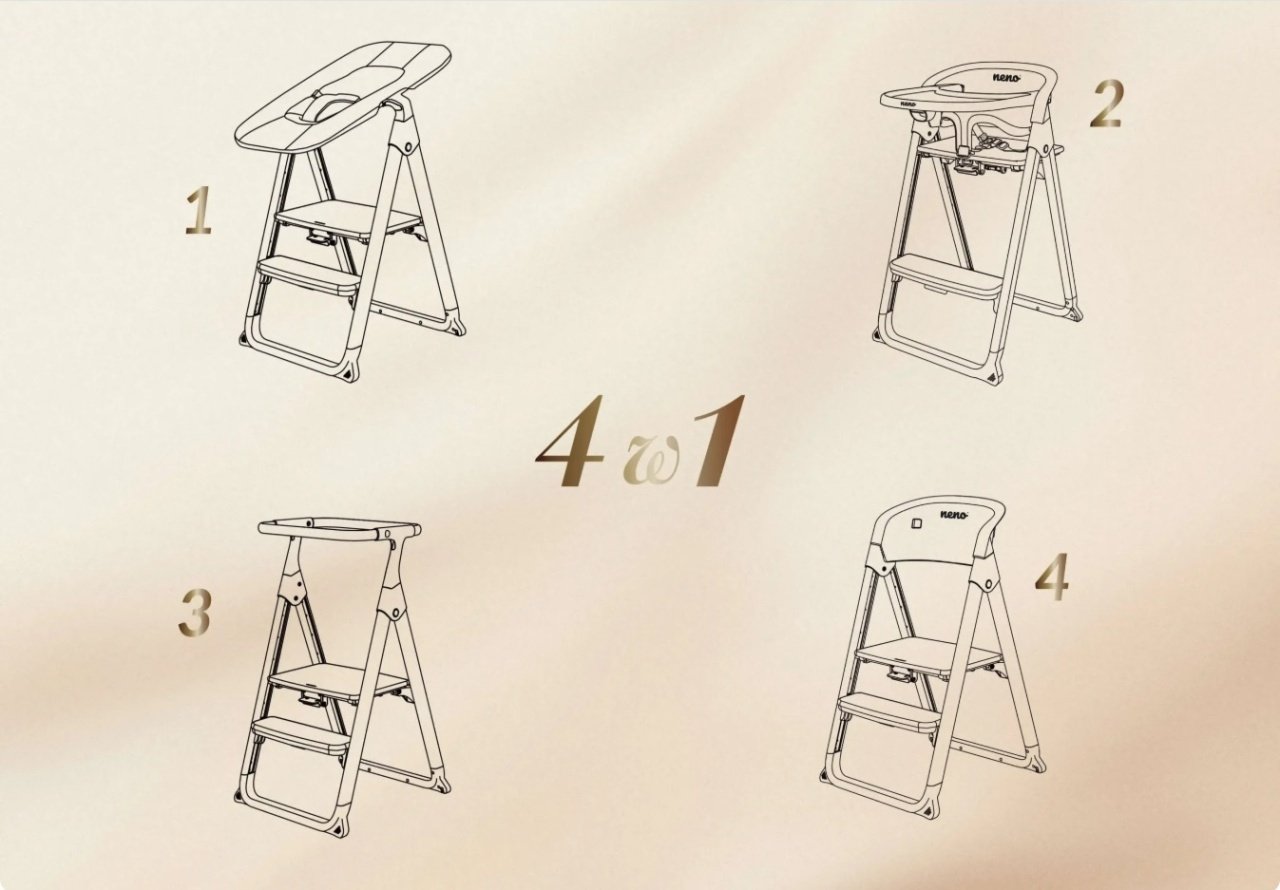 Neno Sapori Gray este un scaun premium 4 în 1, conceput pentru a crește odată cu copilul tău și a-l însoți de la primele luni de viață până la vârsta adultă. Datorită designului inteligent și construcției solide, poate fi utilizat ca leagăn înalt pentru bebeluși, scaun de hrănire, ajutor de bucătărie și scaun pentru adulți.