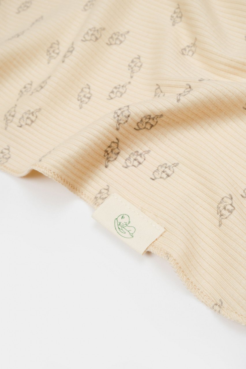 – Este realizat din 50% modal+50% bumbac – material certificat GOTS, delicat cu pielea gingasa a a bebelusului. Printurile sunt cu vopseluri pe baza de apa si toate produsele sunt in concordanta cu standardele GOTS.
