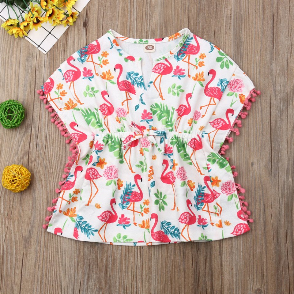 Rochie de plaja cu imprimeu exotic si atragator pentru fetite, cu rascroiala ampla la maneci si cu maneci scurte.