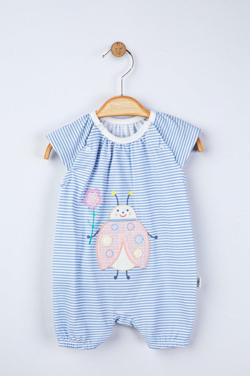 Salopeta de vara cu buburuza din bumbac, delicata cu pielea bebelusului, ideala pentru plimbari in zilele de vara.