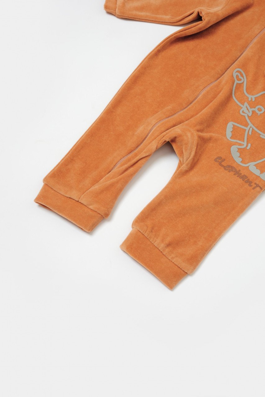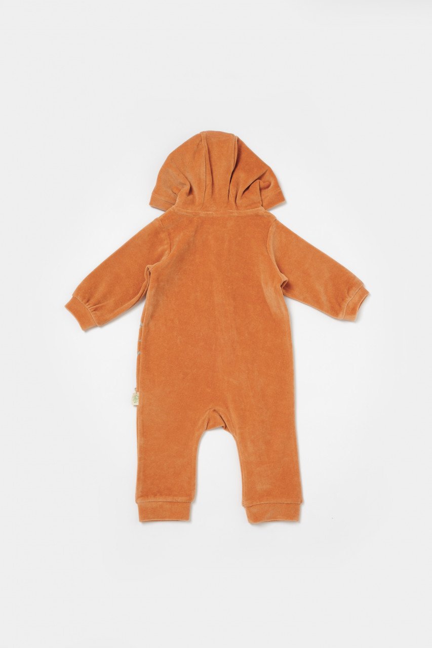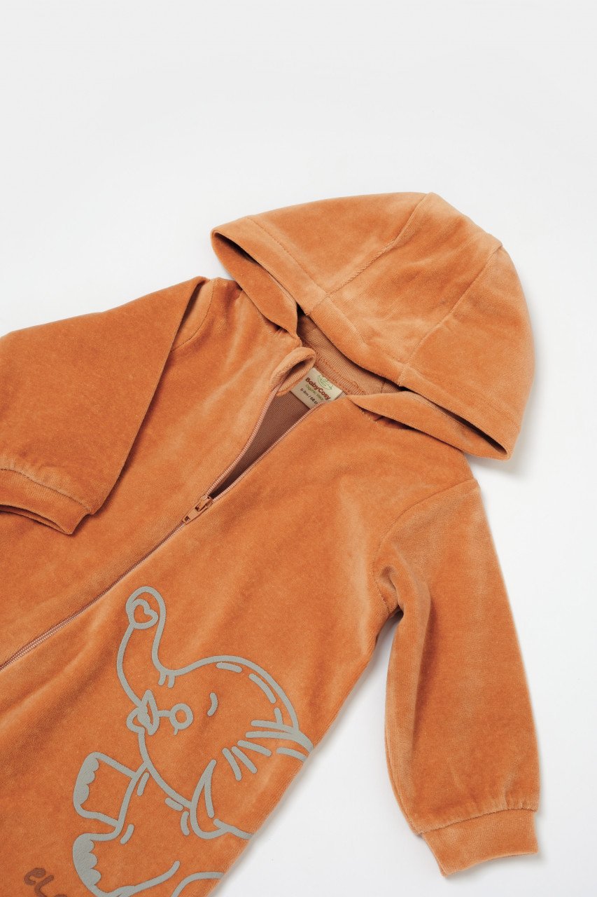 Salopeta Elefant cu maneca lunga si gluga din 80%bumbac organic si 20% poliester – Caramiziu, BabyCosy (Marime: 12-18 Luni)