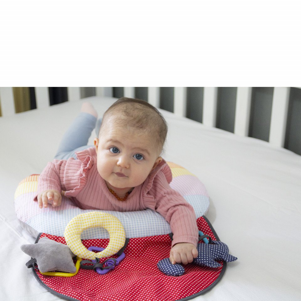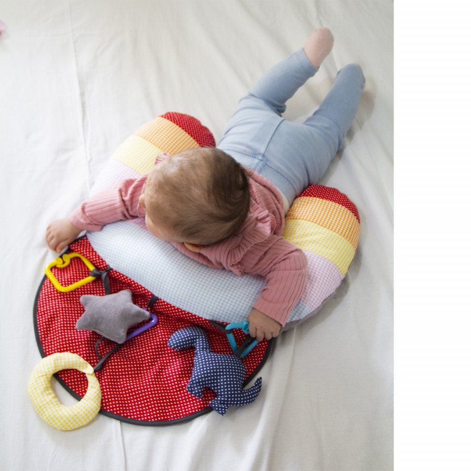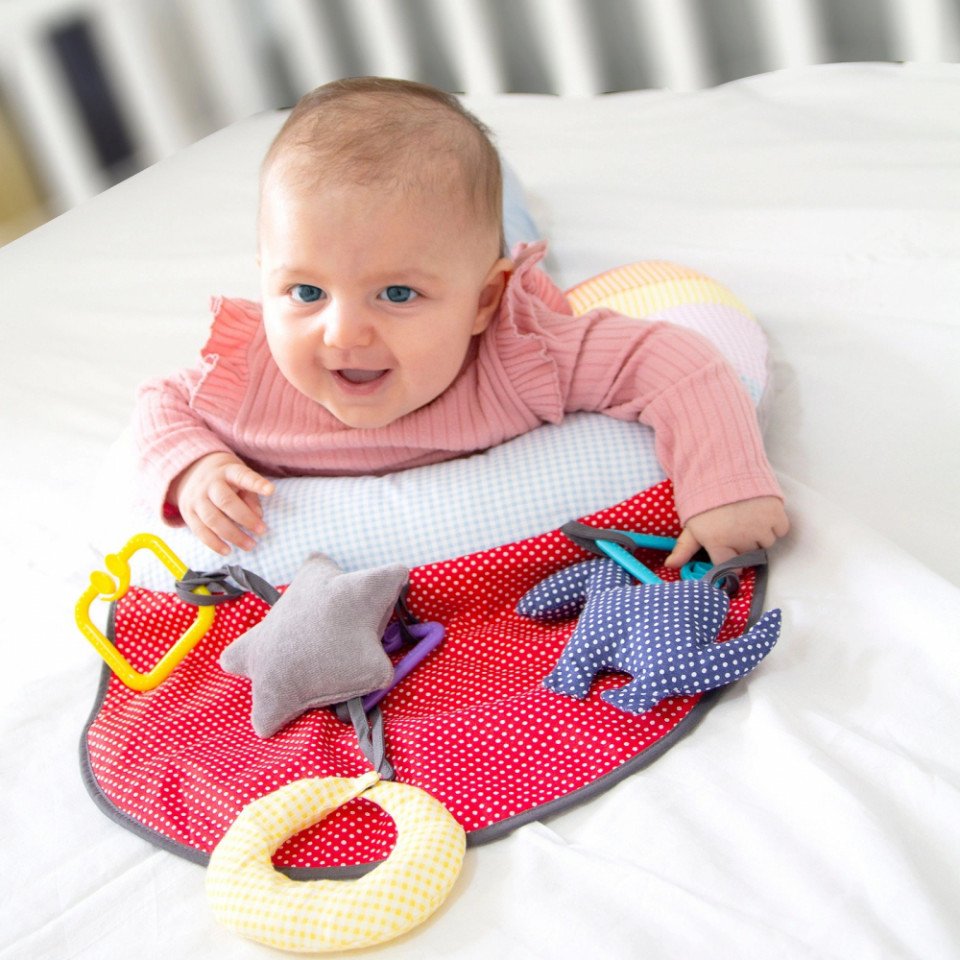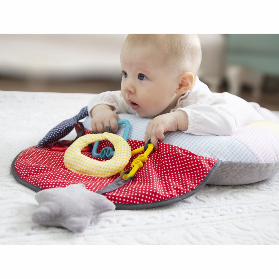 Babyjem Toy Educational Pillow este conceput pentru a sprijini dezvoltarea abilitatilor motorii ale bebelusului tau culcat in pozitia corecta, realizat din material moale si design ergonomic.
