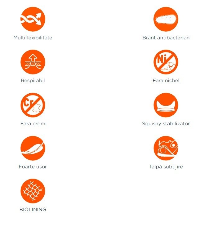 – Talpă flexibilă: flexibilă şi antiderapantă pentru a permite mișcarea naturală a piciorului.