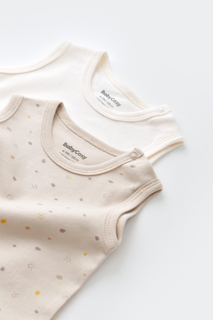 Set 2 body-uri fara maneci bebe unisex -100% bumbac organic – Crem cu buline, BabyCosy (Marime: 6-9 luni)