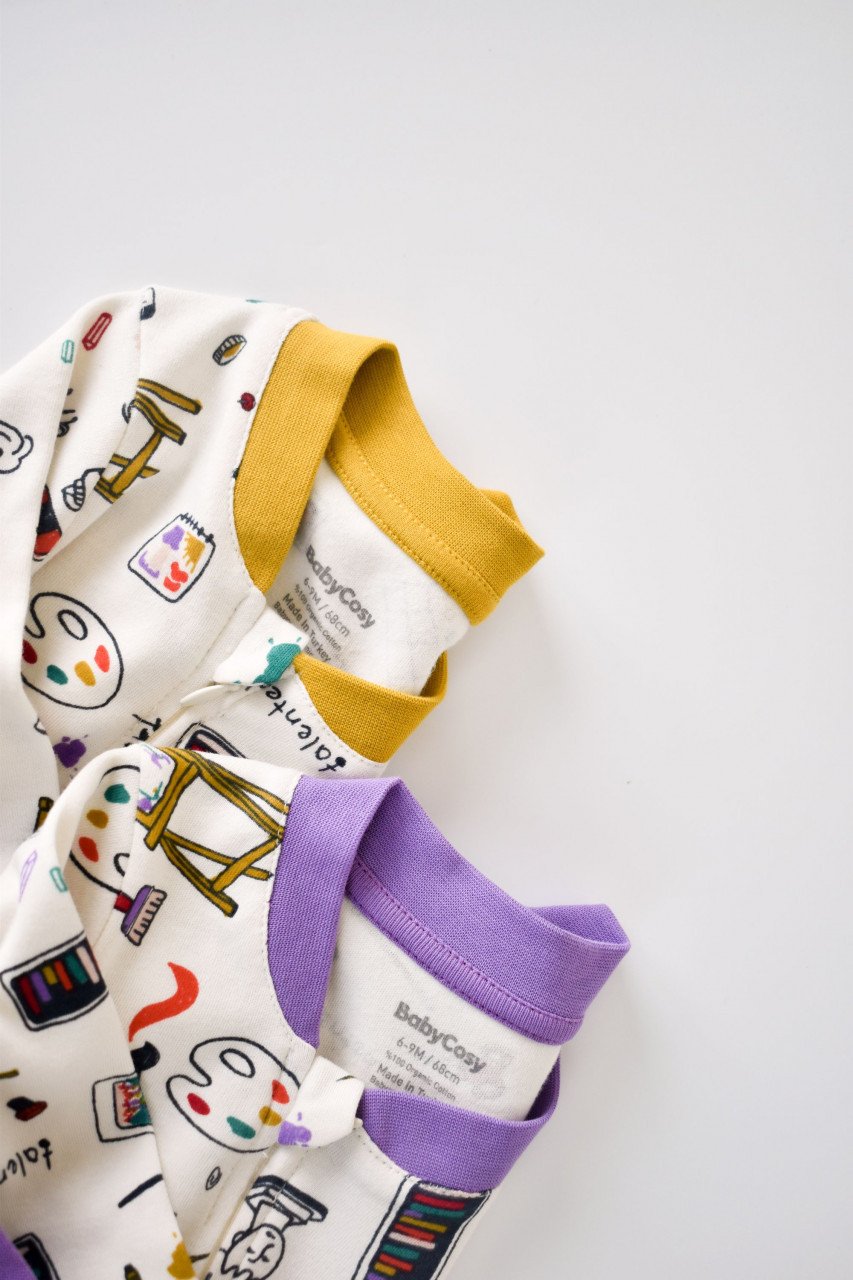Set 2 salopetele cu maneca lunga si pantaloni lungi cu fermoar – 100%bumbac organic – Galben si Mov, BabyCosy (Marime: 9-12 luni)