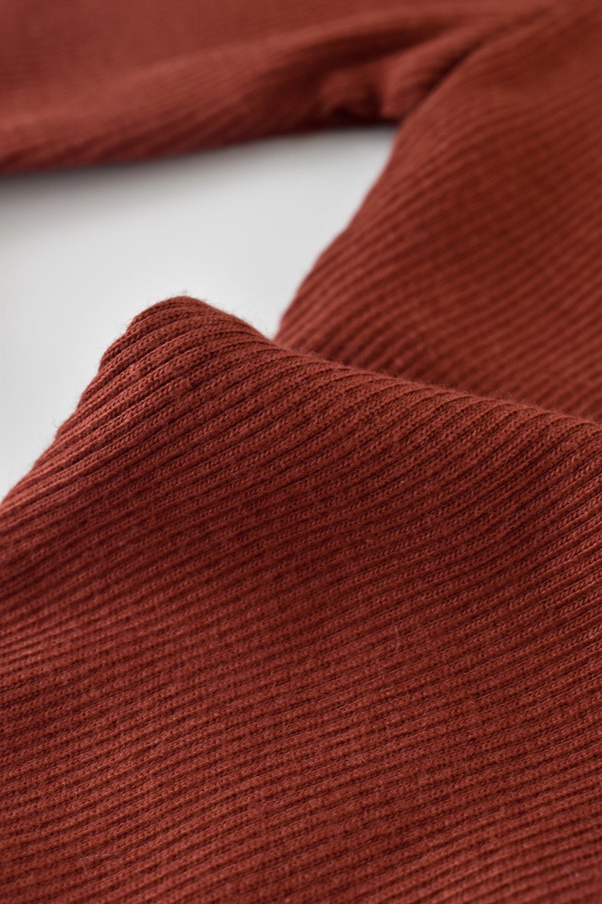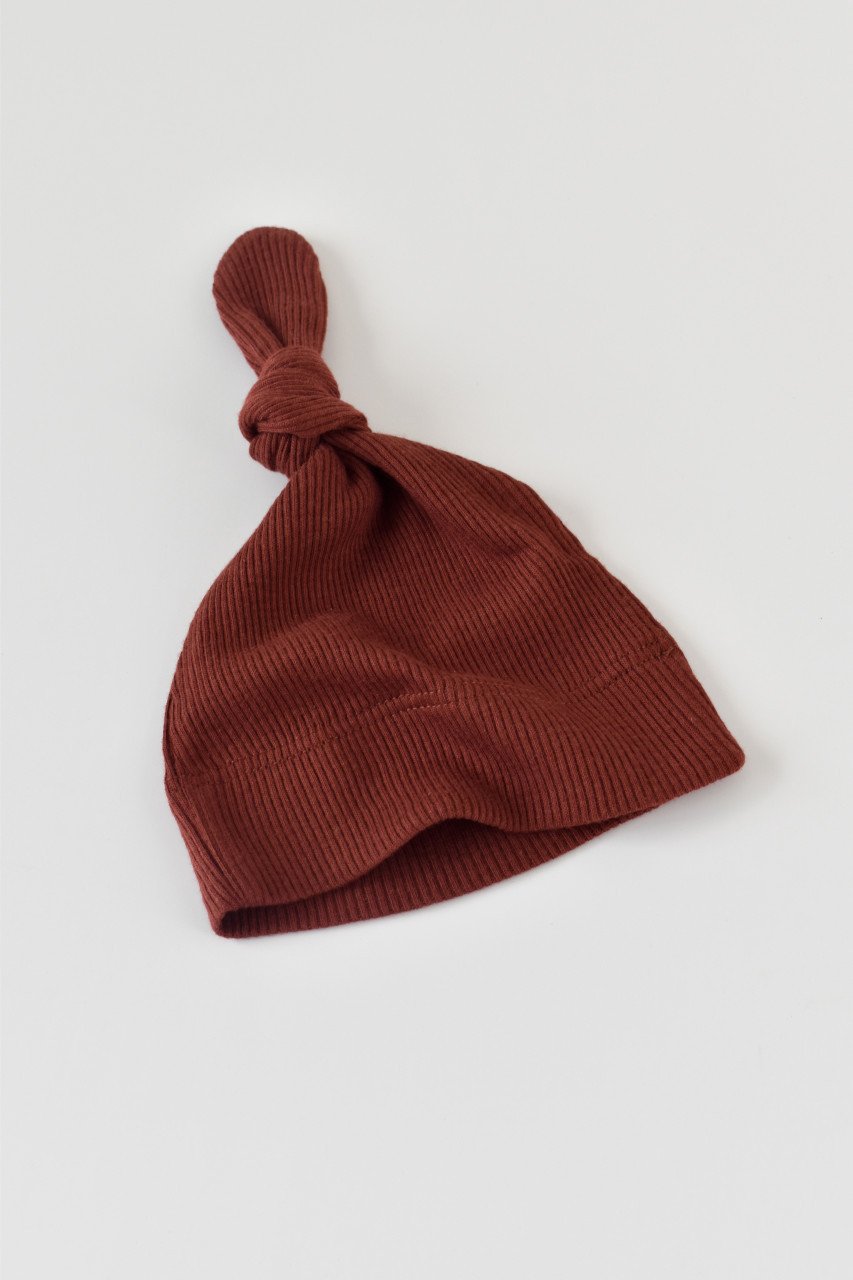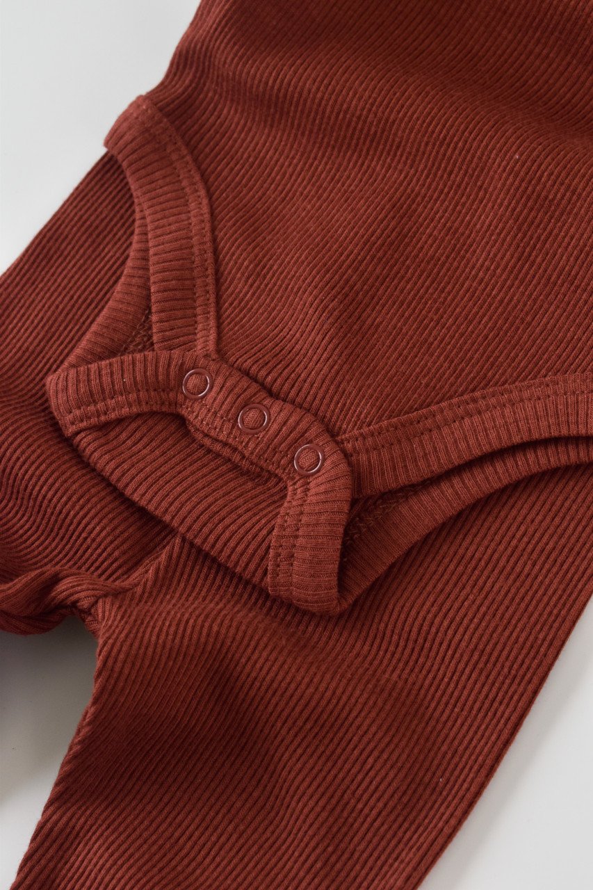 Set 3 piese: body cu maneca lunga, pantaloni lungi cu botosei si caciulita din bumbac organic si modal – Caramiziu, BabyCosy (Marime: 0-3 Luni)
