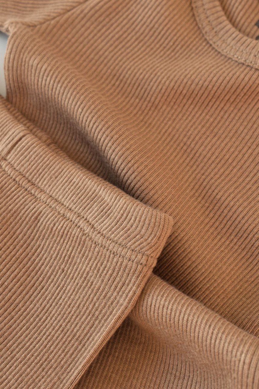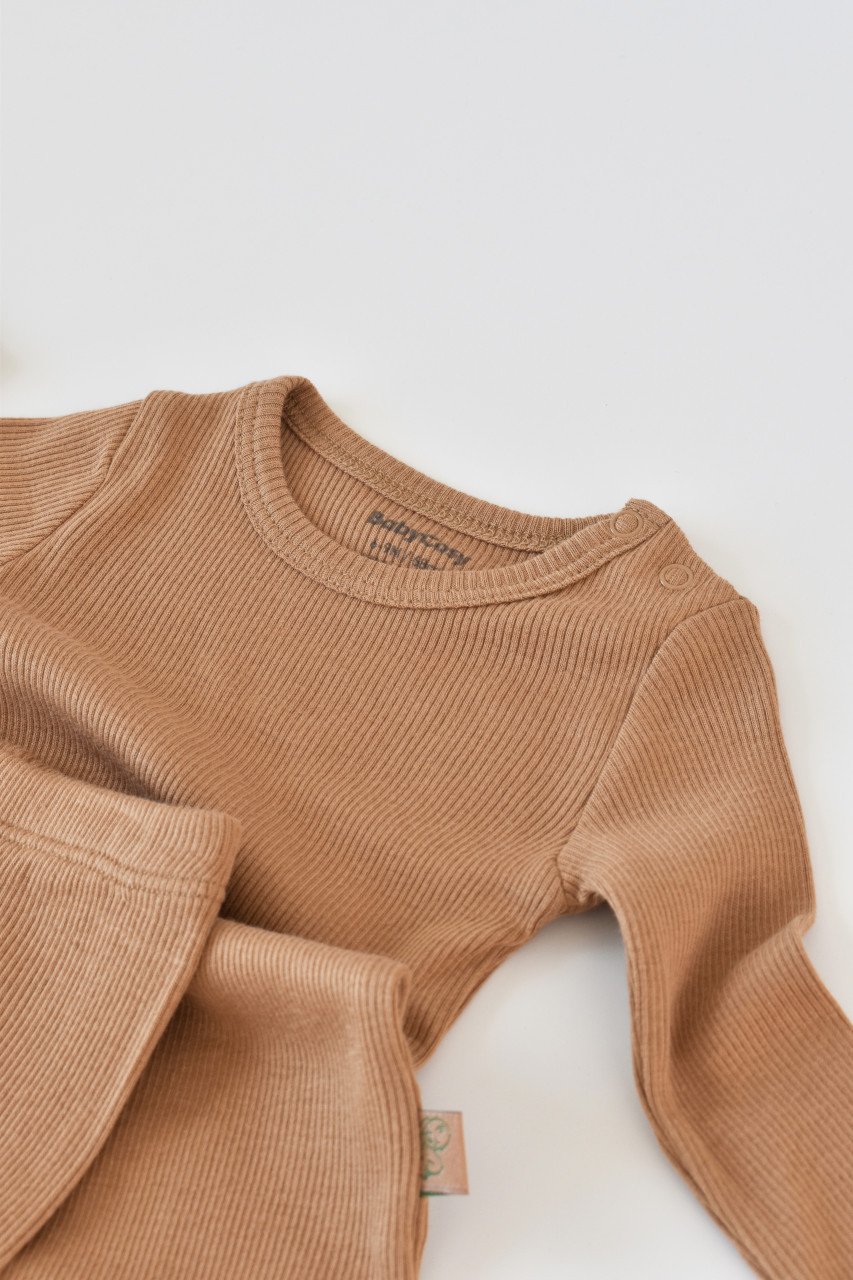 Set 3 piese: body cu maneca lunga, pantaloni lungi cu botosei si caciulita din bumbac organic si modal – Maro BabyCosy (Marime: 0-3 Luni)