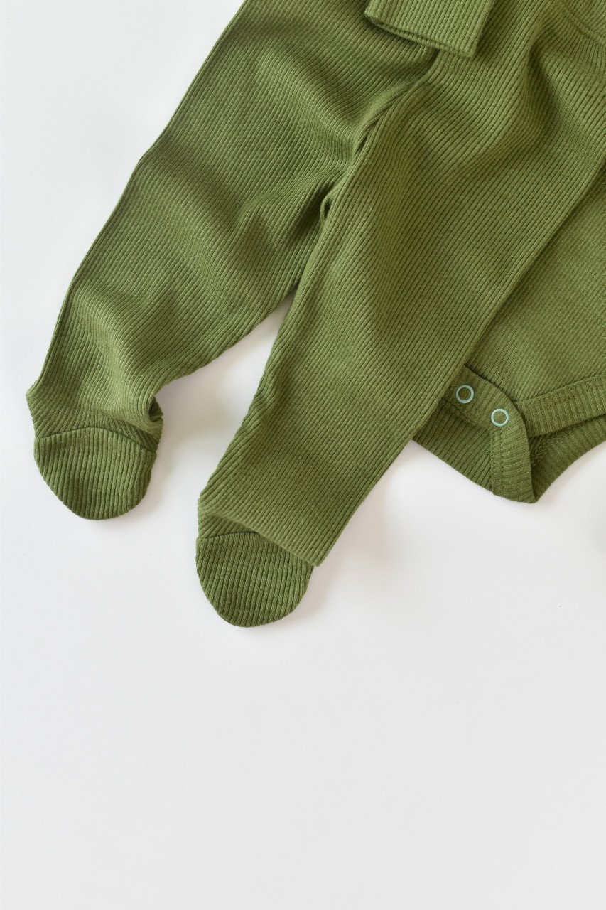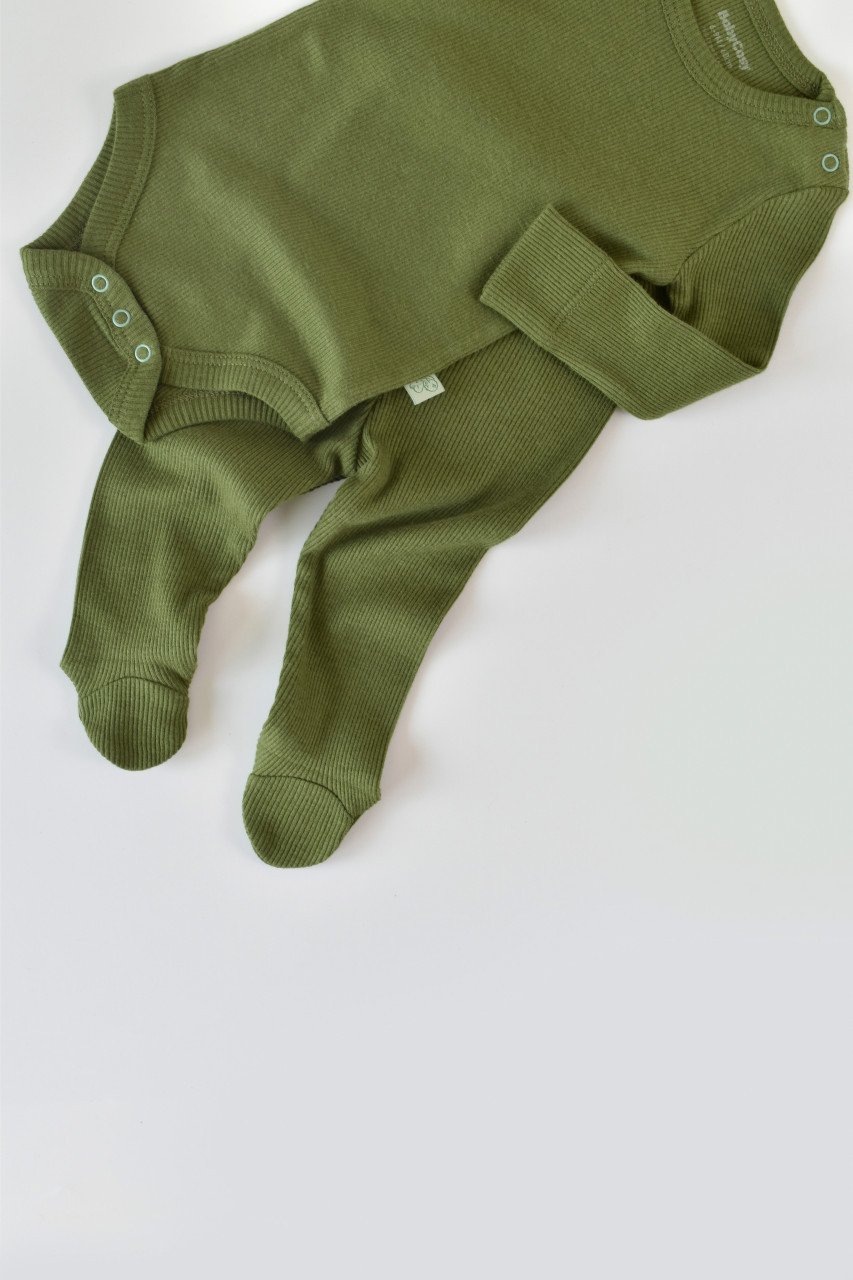 Set 3 piese: body cu maneca lunga, pantaloni lungi cu botosei si caciulita din bumbac organic si modal – Verde BabyCosy (Marime: 3-6 Luni)