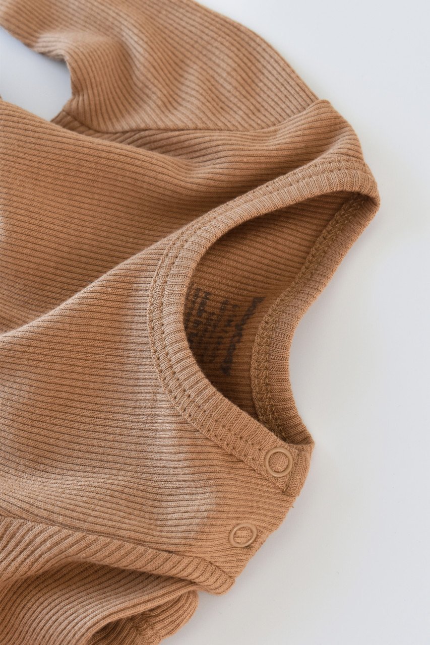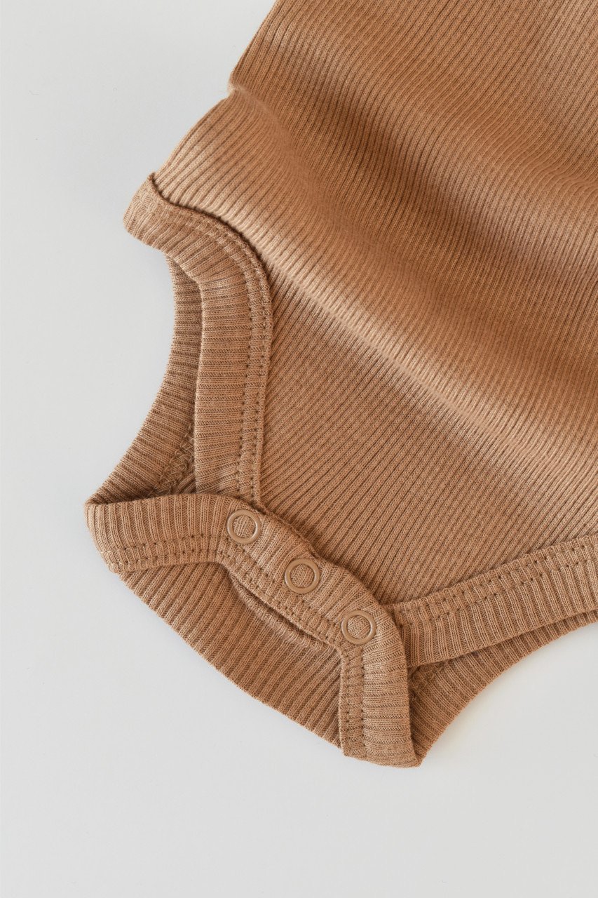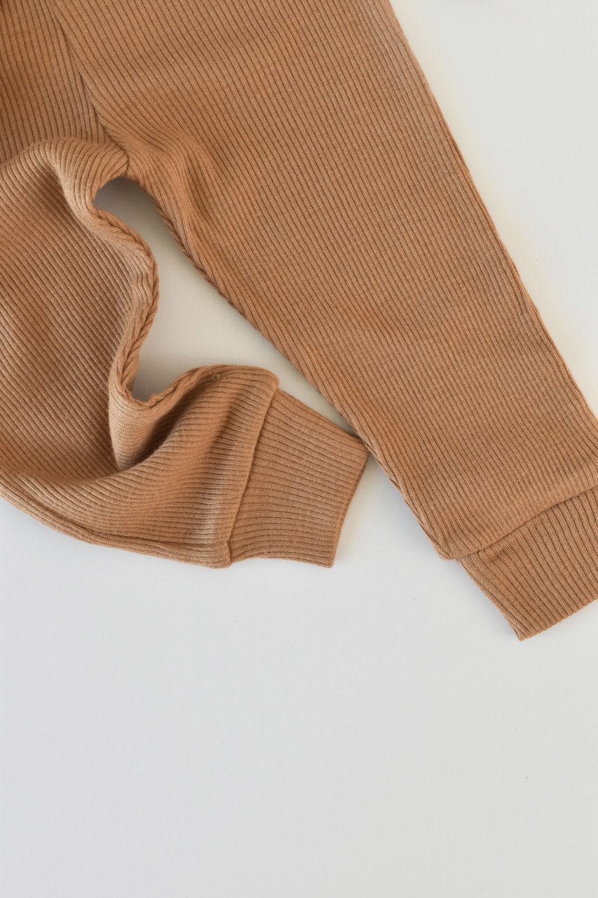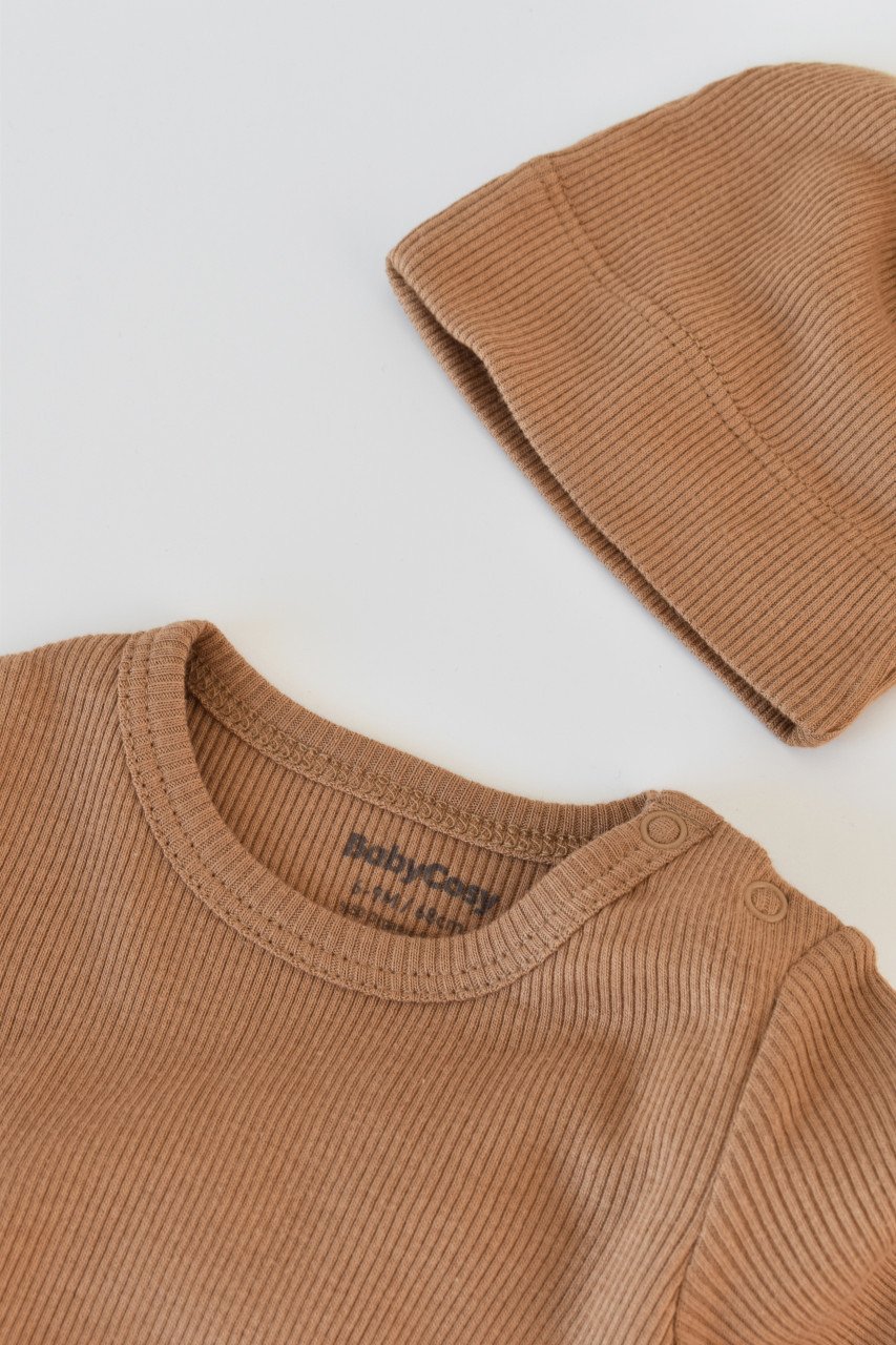 Set 3 piese: body cu maneca lunga, pantaloni lungi si caciulita din bumbac organic si modal – Maro BabyCosy (Marime: 9-12 luni)