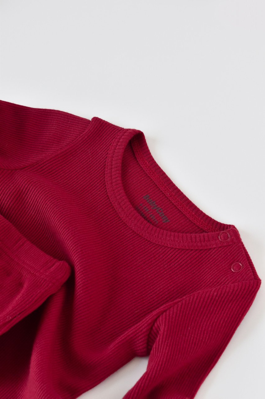 Set 3 piese: body cu maneca lunga, pantaloni lungi si caciulita din bumbac organic si modal – Rosu, BabyCosy (Marime: 18-24 Luni)