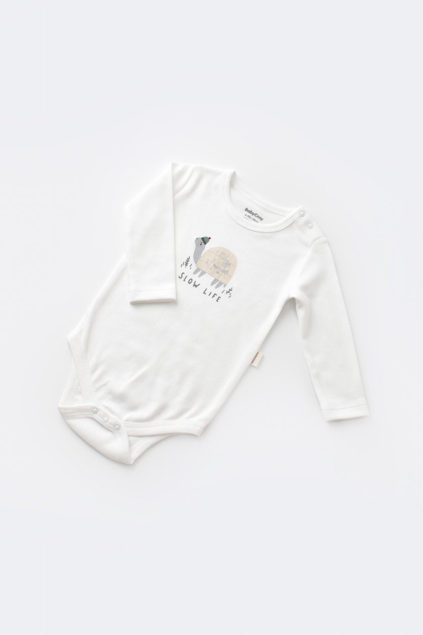 2. Body-ul cu maneci lungi, din 100% bumbac organic, se inchide cu capse intre picioruse si la umar. De asemenea, are printata o mica broscuta testoasa