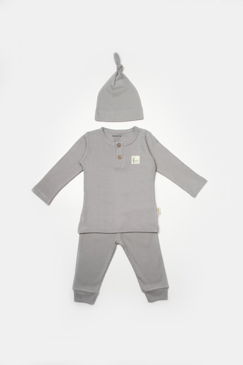 Set 3 piese:bluza, pantaloni si caciulita Bamboo, gri, BabyCosy, 50% bumbac+50%bambus (Marime: 18-24 Luni)