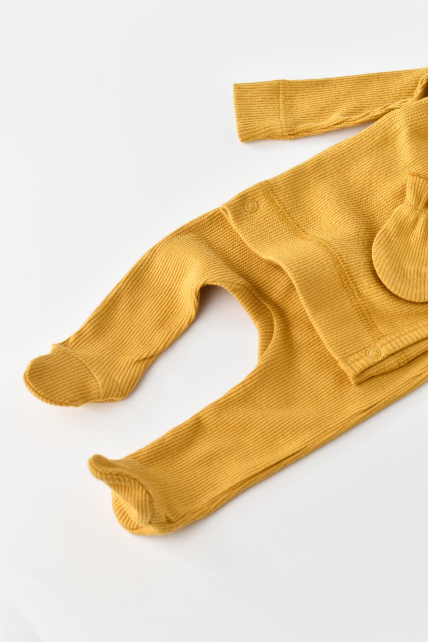Set 4 piese: bluza, pantaloni, caciulita si manusi din bumbac organic si modal – Mustar, Baby Cosy (Marime: 6-9 luni)