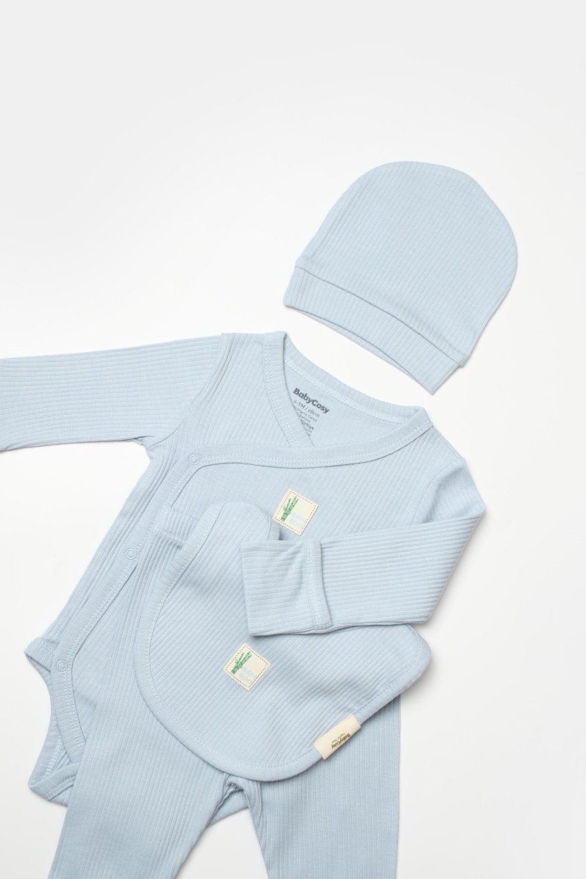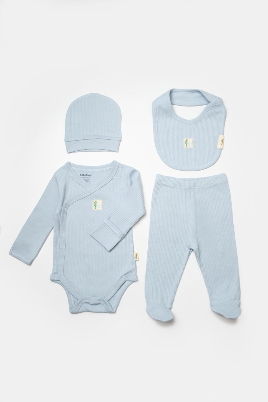 Set 4 piese:body, pantaloni, baveta si caciulita Bamboo, bleu, BabyCosy, 50% bumbac+50%bambus (Marime: 0-3 Luni)