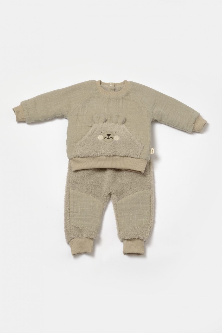 Set bluza cu buzunar si pantaloni Ursulet, Winter muselin, 100% bumbac dublat – Verde, BabyCosy (Marime: 6-9 luni)