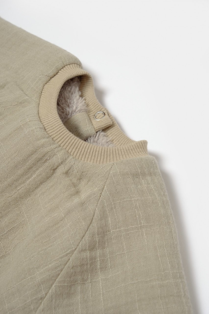 2. Bluza cu maneci lungi, din 100% bumbac – muselina dublata cu blanita, are un buzunar haios cu ursulet cu urechiuse. Materialul este dublat oferind un plus de confort. Acesta setul perfect pentru zilele mai friguroase. Aceasta se inchide cu nasturei la spate.