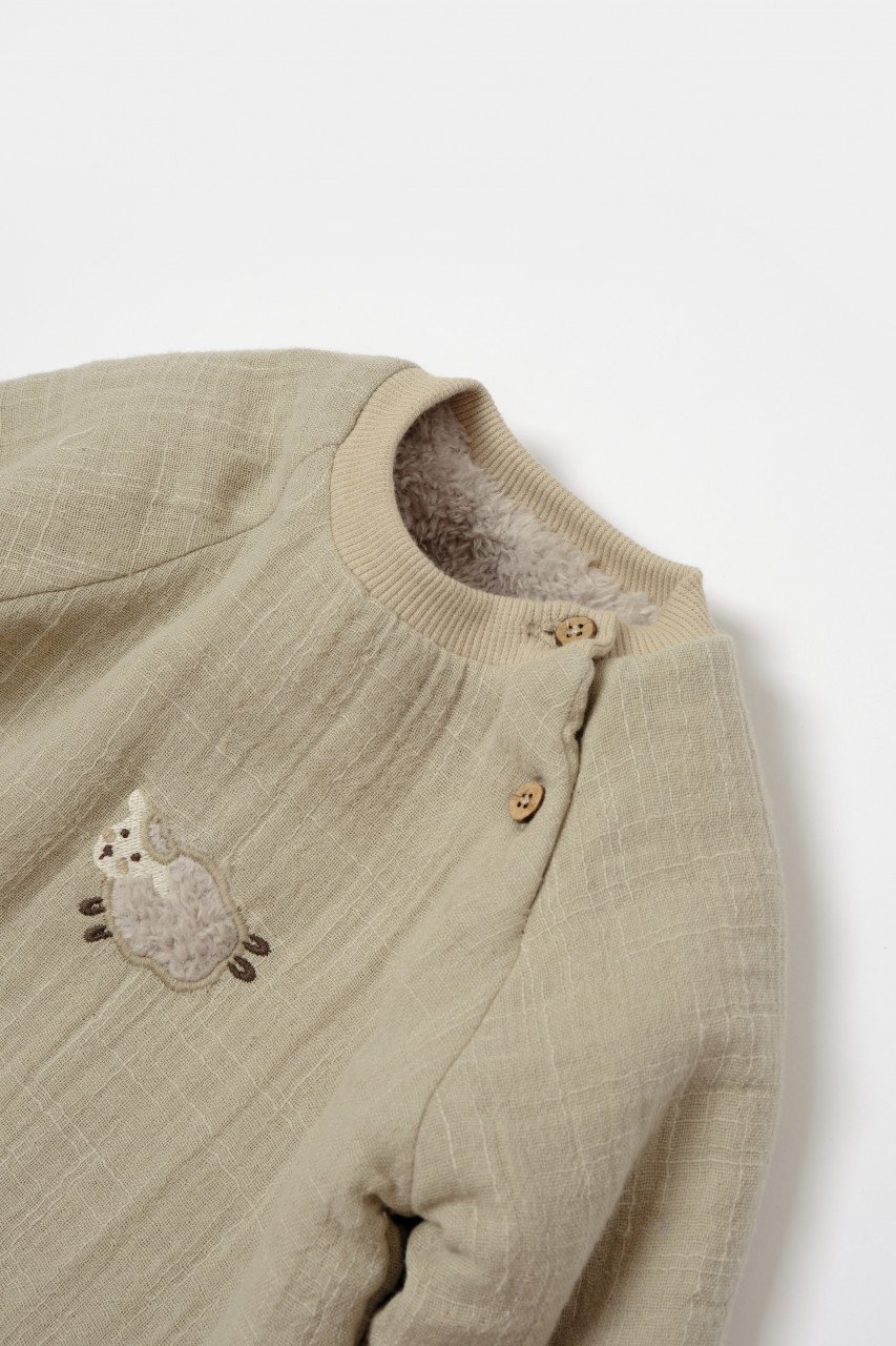 2. Bluza cu maneci lungi, din 100% bumbac la exterior si poliester la interior – muselina are un imprimeu haios cu oita pe piept. Materialul este dublat oferind un plus de confort si fiind setul perfect pentru zilele mai friguroase. Aceasta se inchide cu nasturei la gat.