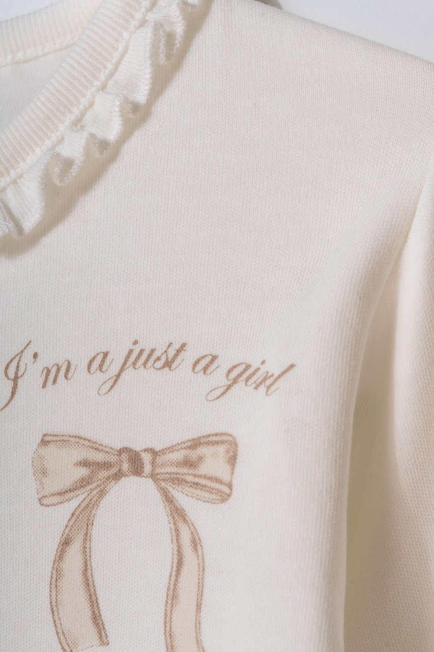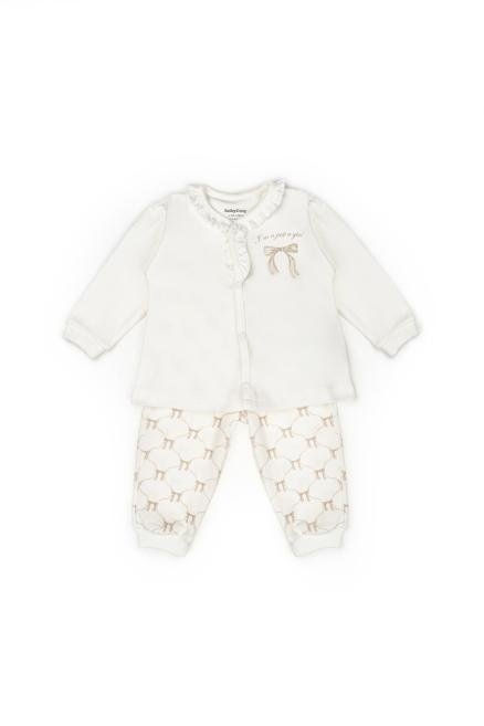 Bluzița este decorată cu guler cu volănaș, are capse în partea din față pentru îmbrăcare rapidă și ușoară, iar pe piept este imprimată o fundiță delicată. Pantalonașii vin într-o nuanță pudrată, elegantă, cu un imprimeu fin, plin de fundițe, completând perfect ținuta.