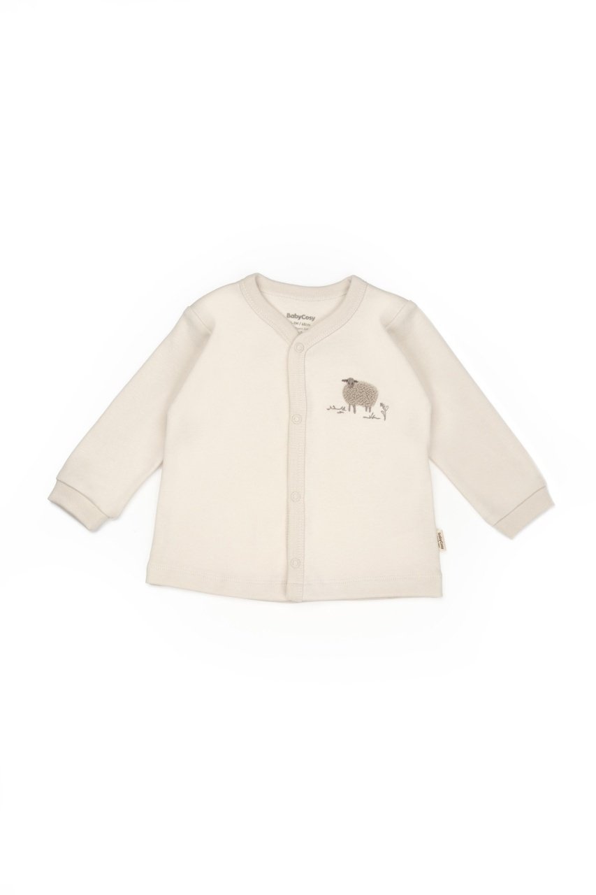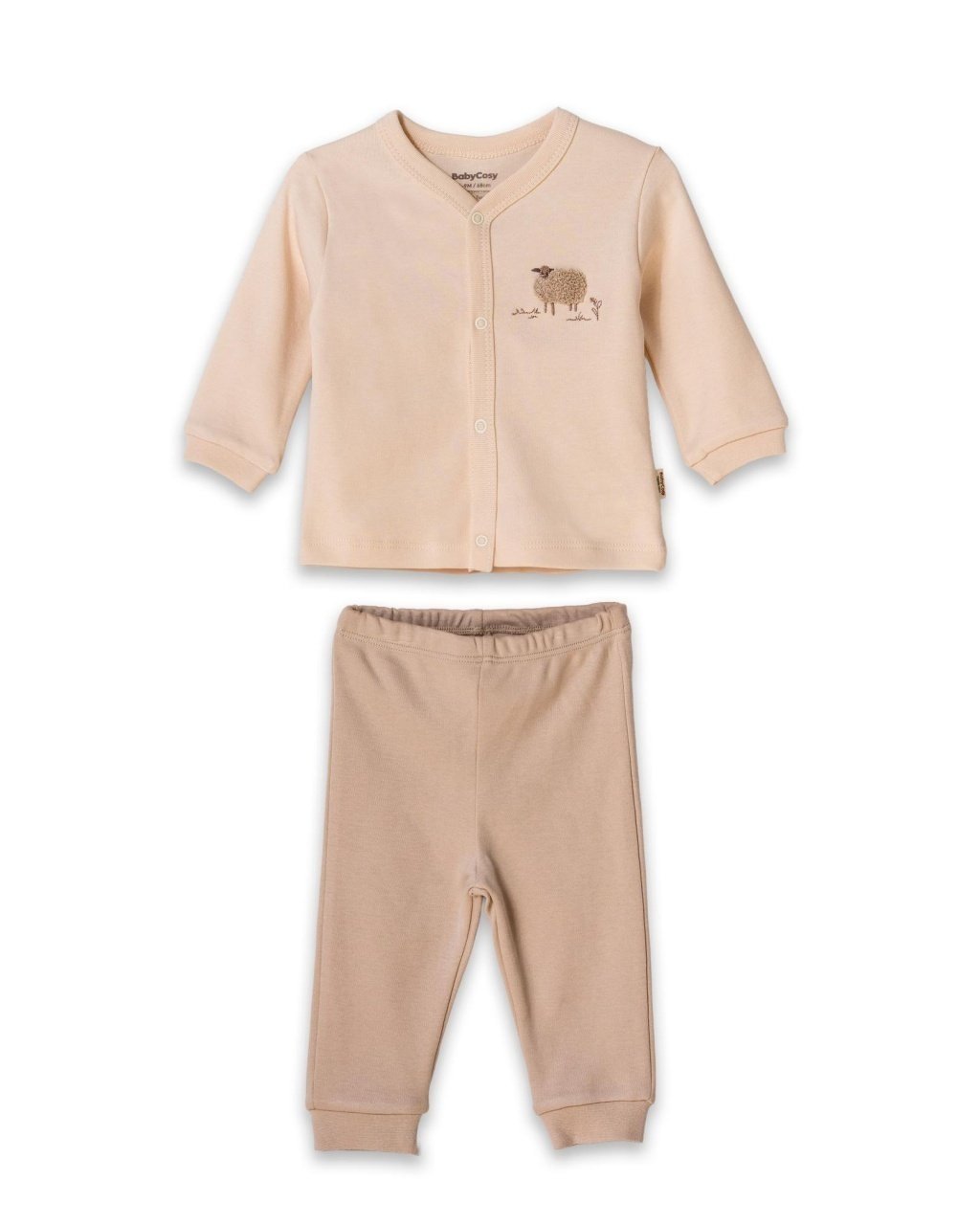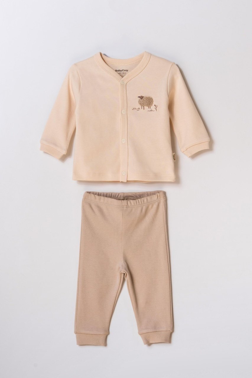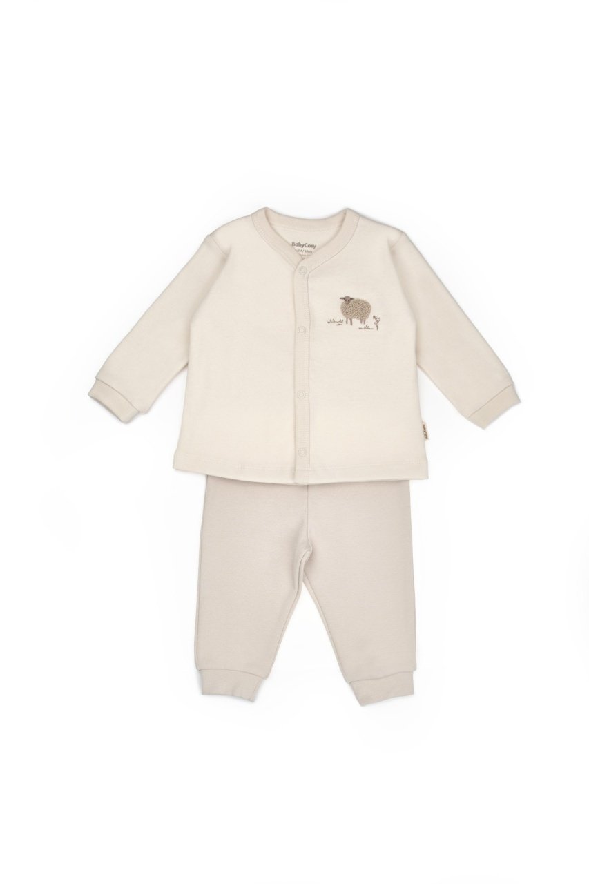 Acest set adorabil de la BabyCosy Organic Wear este format dintr-o bluză cu capse pe toată lungimea și pantalonași moi și confortabili, confecționați din bumbac organic certificat GOTS, delicat cu pielea sensibilă a bebelușului.