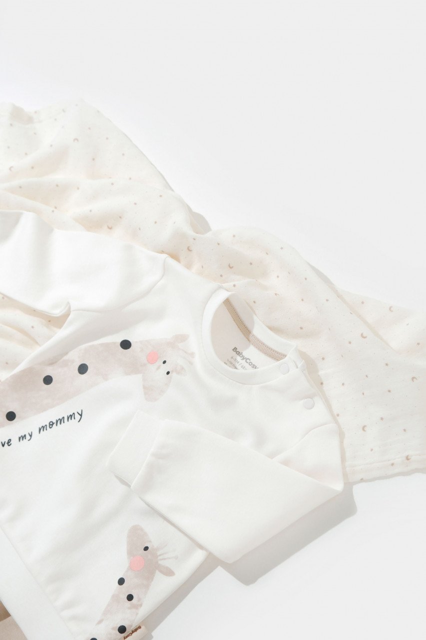 Set bluzita cu maneca lunga si pantaloni lungi Girafa, BabyCosy, 100% bumbac organic, Ecru (Marime: 9-12 luni)