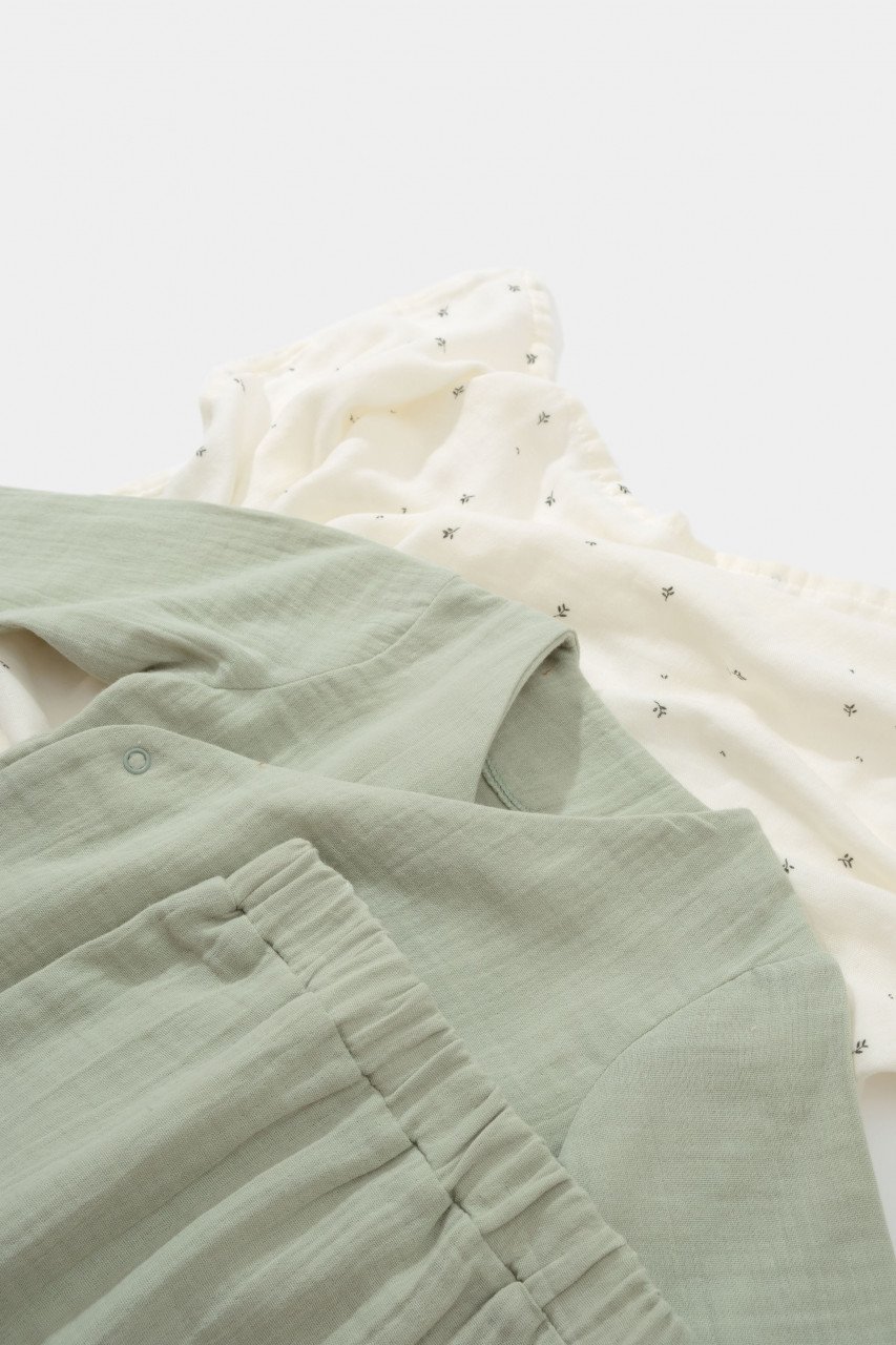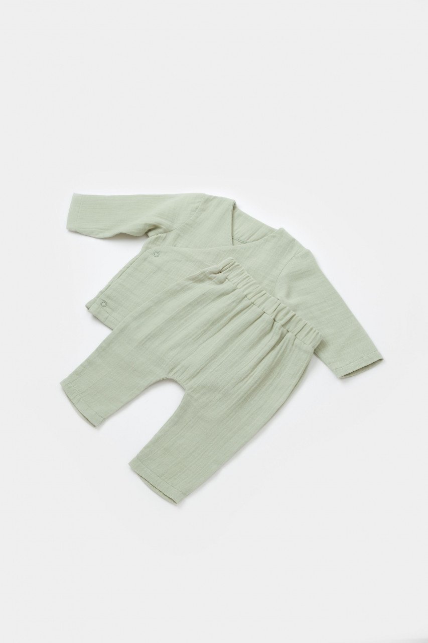 Set bluzita petrecuta si pantaloni lungi din muselina, BabyCosy, 100% bumbac organic, Verde (Marime: 3-6 Luni)