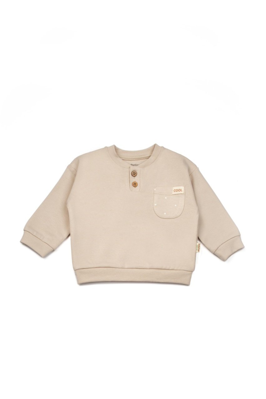 2. Bluza cu maneci lungi, din 100% bumbac are un buzunar cu mesaj la piept. Aceasta se inchide cu 2 nasturasi pentru a putea fi imbracat/dezbracat cat mai usor