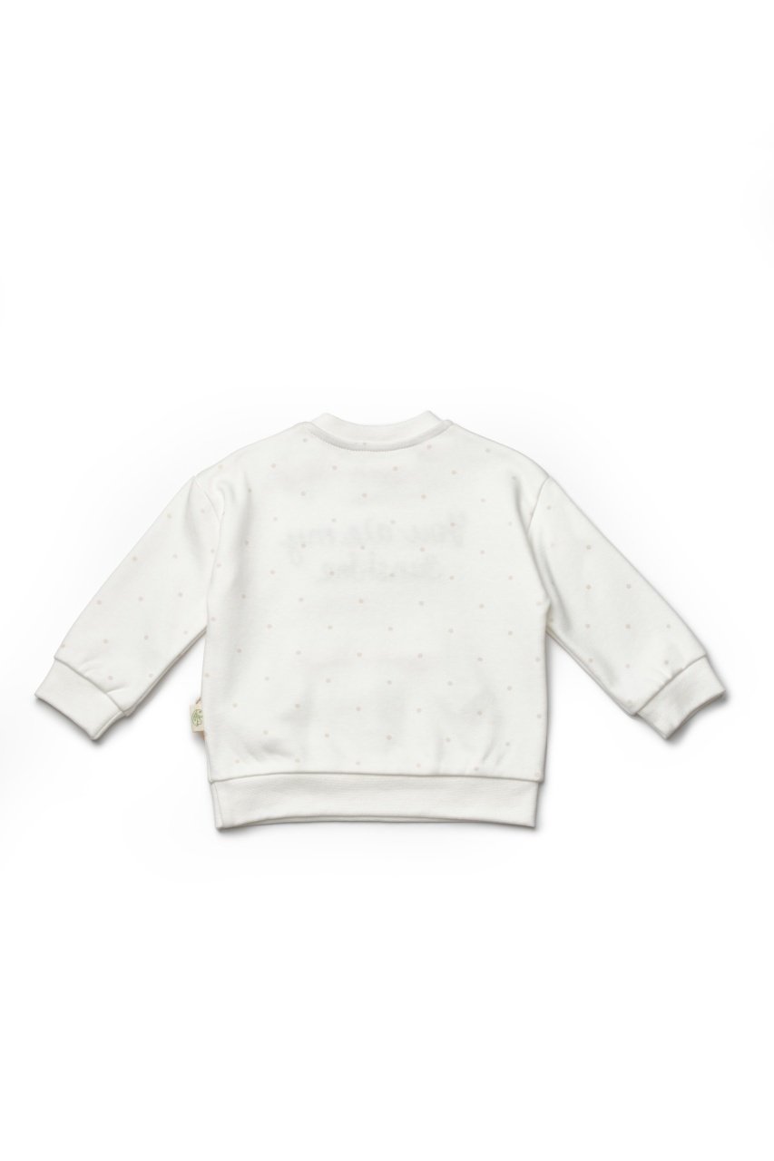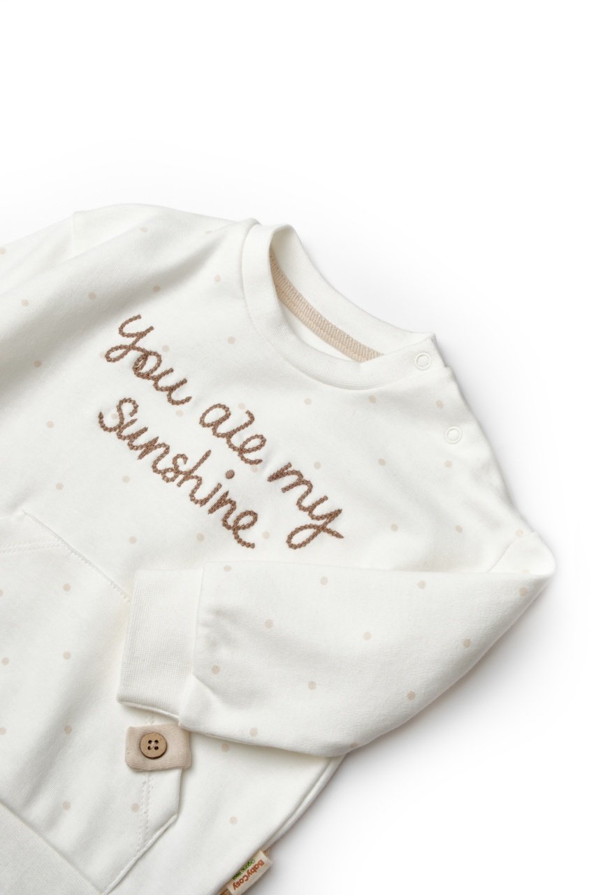 2. Bluza cu maneci lungi, din 100% bumbac are un mesaj brodat pe piept. . Aceasta se inchide cu capse la umar pentru a putea fi imbracat/dezbracat cat mai usor
