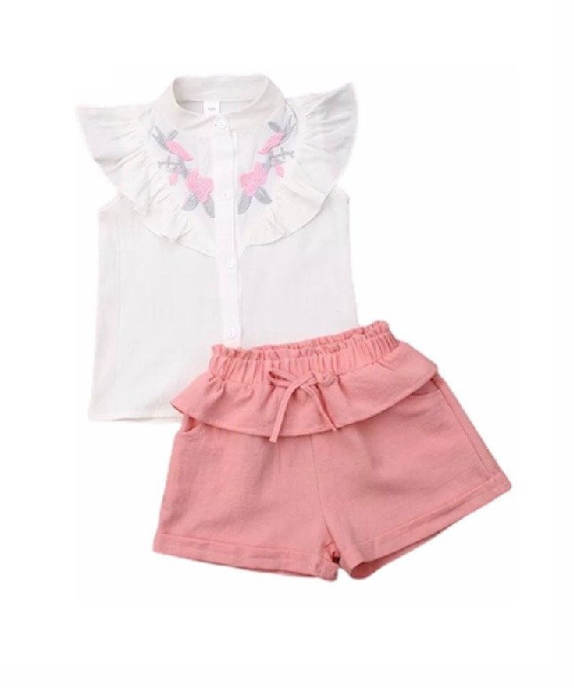Set camasuta si pantaloni cu broderie Compus din camasuta si pantaloni scurti Camasuta este realizata din panza topita cu broderie si volanas prezente in partea din fata Pantalonii prezinta un volanas si o fundita Disponibil in doua variante de culori: galben si roz