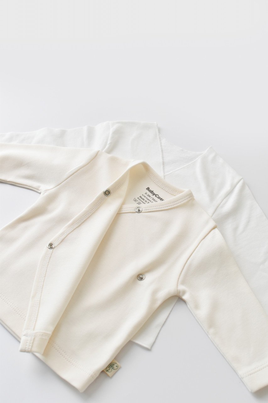 – Bluzita cu maneca lunga, cu inchidere pe lateral cu capse ce nu contin nichel si foarte usor pentru a fi purtat de un bebe nou nascut