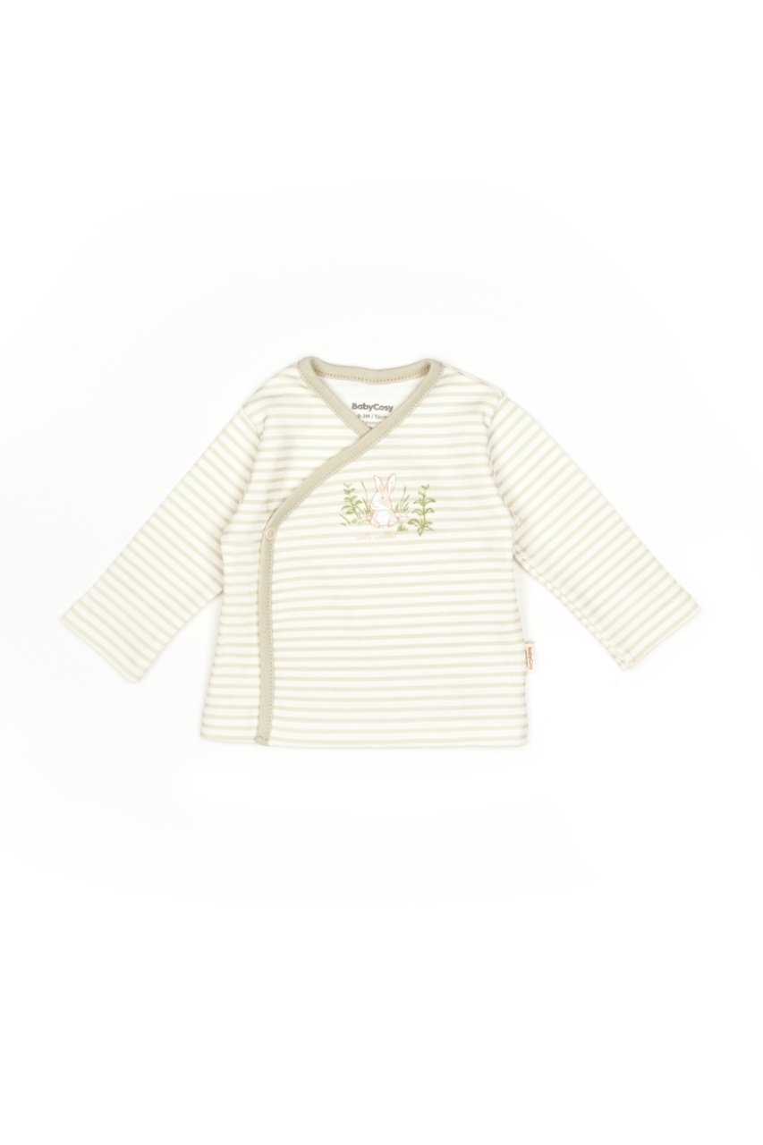 – Bluzita cu maneca lunga, cu inchidere pe lateral cu capse ce nu contin nichel si foarte usor pentru a fi purtat de un bebe nou nascut