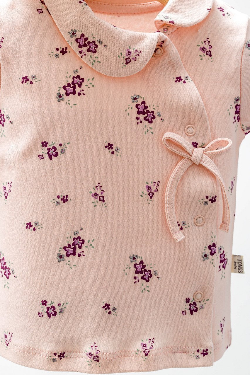 – bluziță cu prindere cu capse, ideala pentru un nou nascut si foarte usor de imbracat, cu o fundita decorativa aplicata