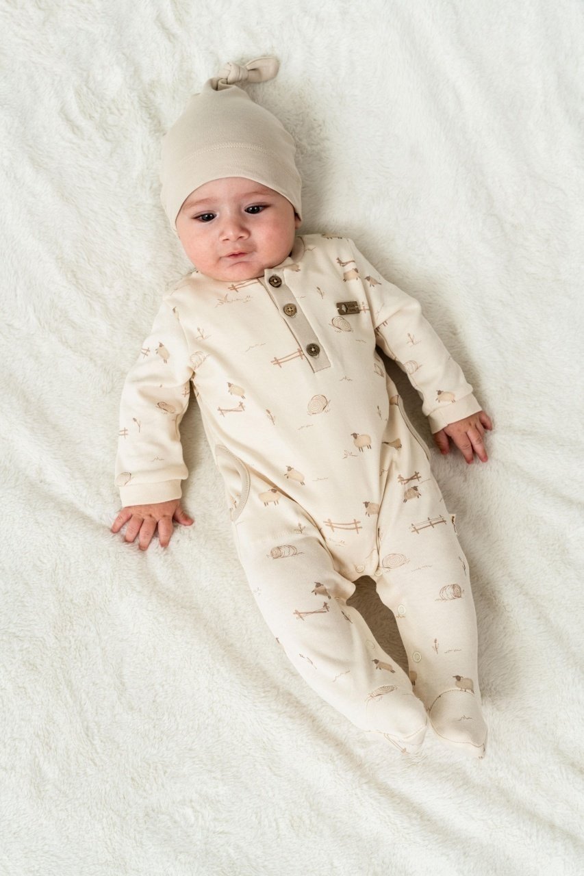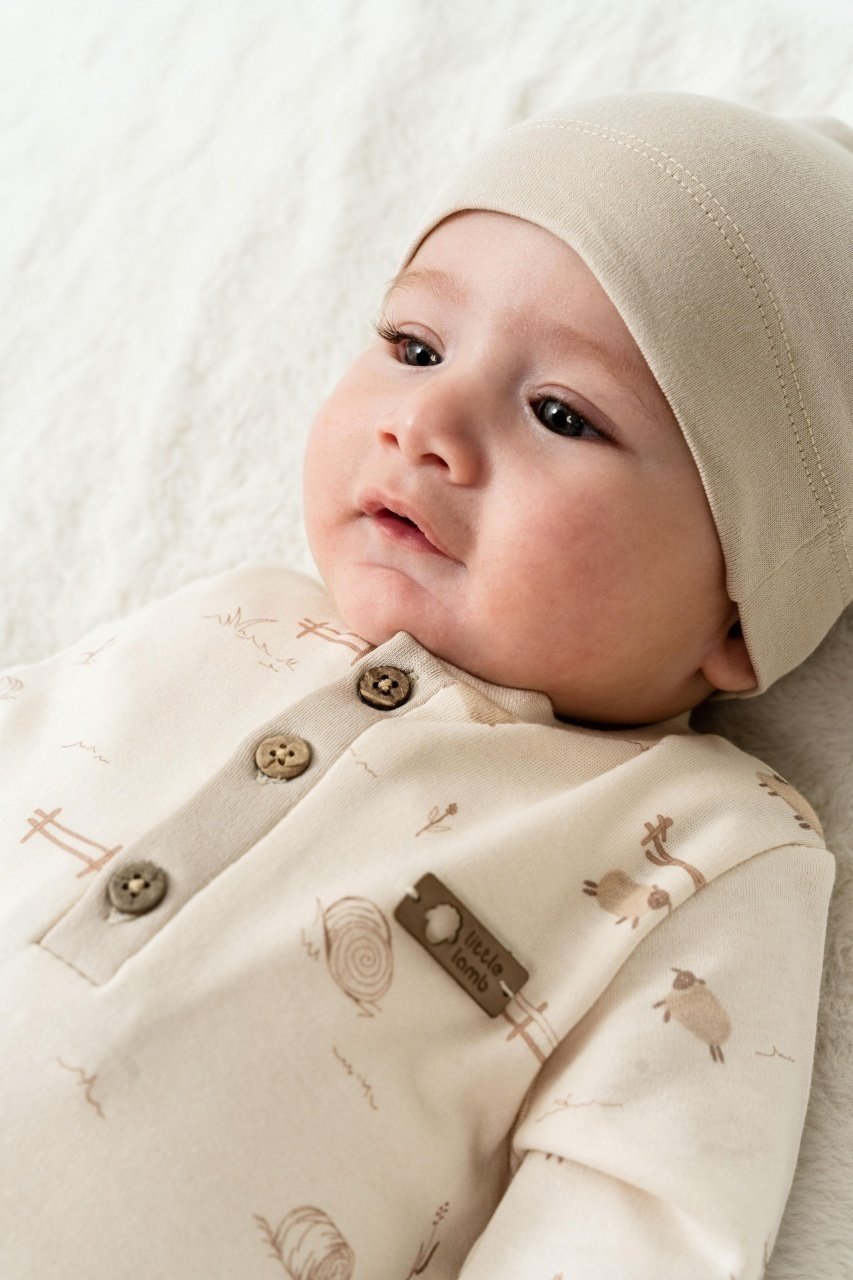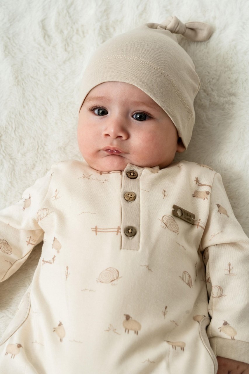 Salopeta are un design adorabil în nuanțe naturale, cu imprimeu fin cu oițe și elemente din natură, fiind completată de o căciuliță asortată cu nod decorativ în vârf. Închiderea practică cu capse în zona picioarelor permite o schimbare ușoară a scutecului, iar nasturii decorativi din lemn adaugă un plus de farmec natural.