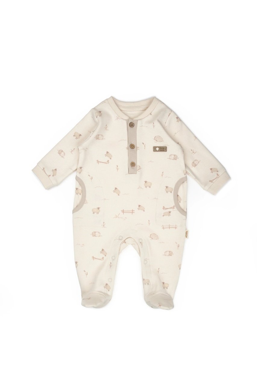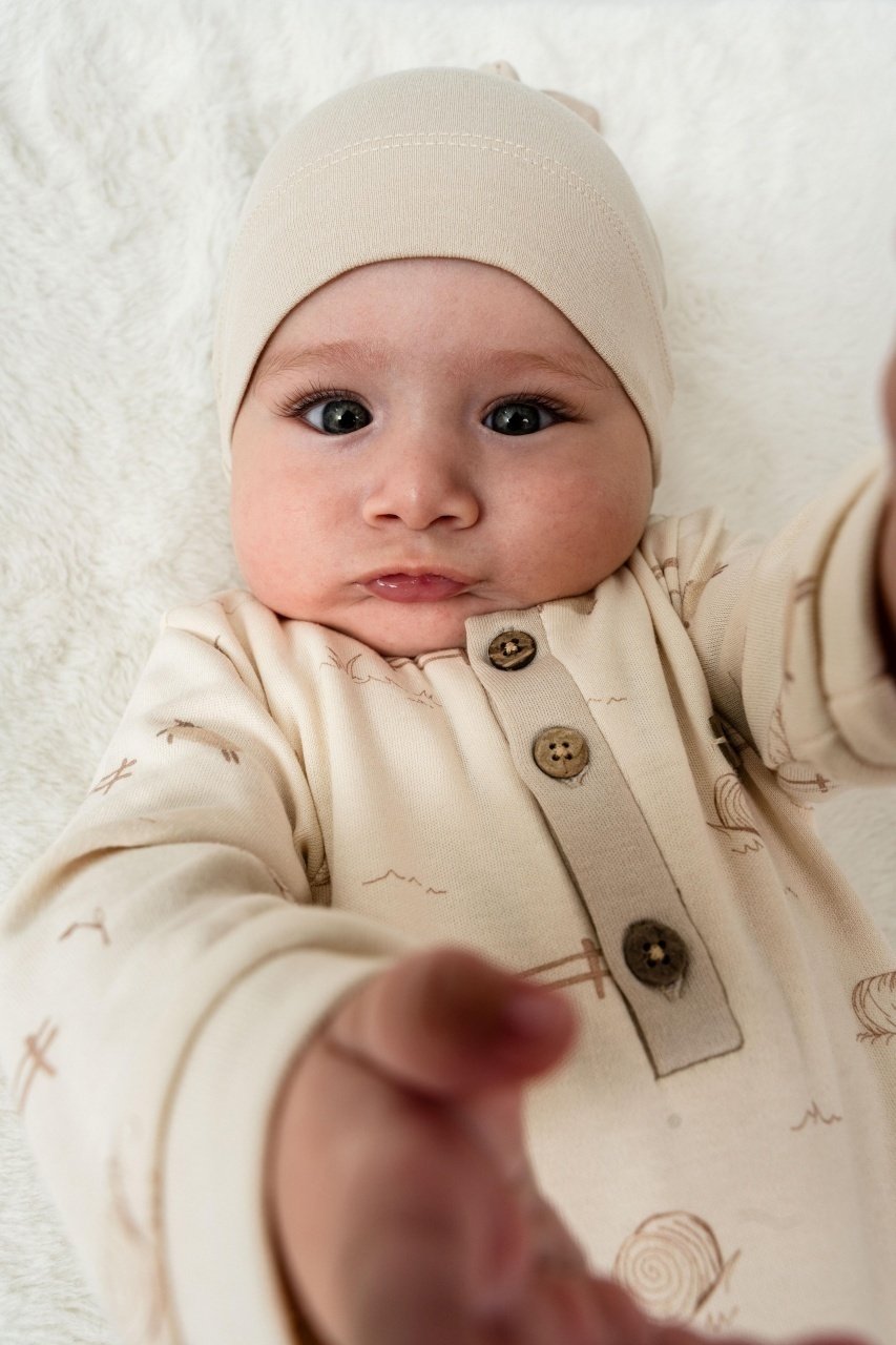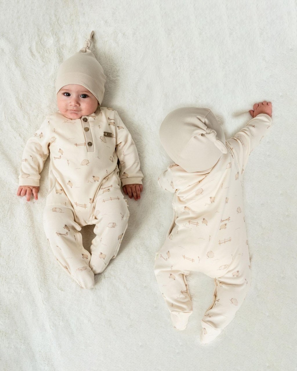 Salopeta are un design adorabil în nuanțe naturale, cu imprimeu fin cu oițe și elemente din natură, fiind completată de o căciuliță asortată cu nod decorativ în vârf. Închiderea practică cu capse în zona picioarelor permite o schimbare ușoară a scutecului, iar nasturii decorativi din lemn adaugă un plus de farmec natural.